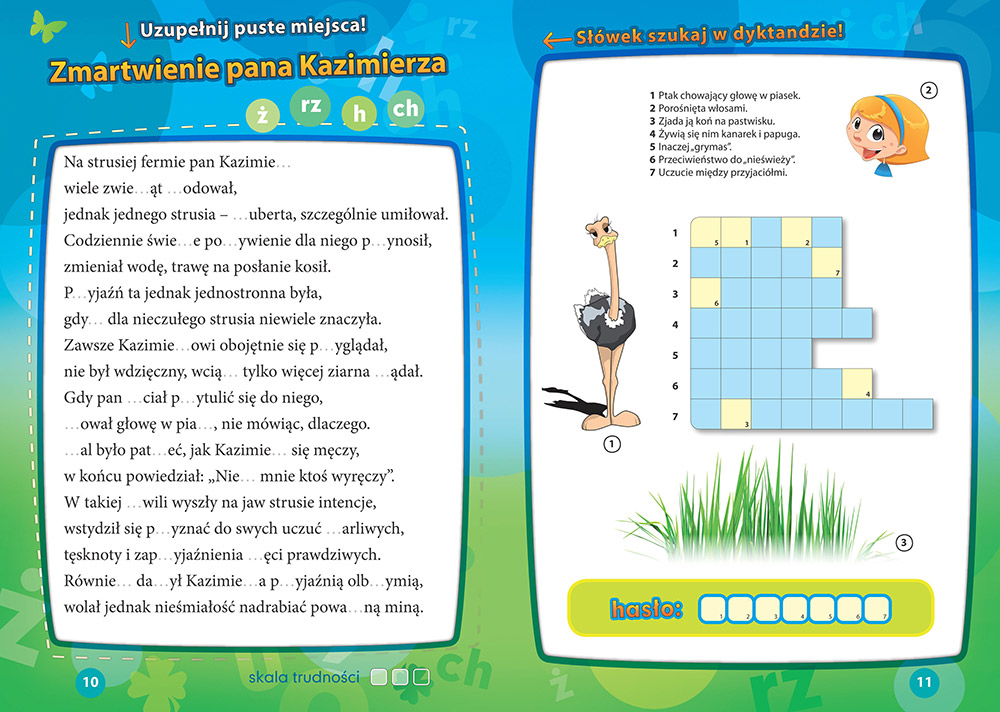 W drugiej czê¶ci natomiast s± teksty, które trzeba dziecku podyktowaæ - dziêki temu ma szansê æwiczyæ dyktanda tak, jak w szkole. Odskoczni± od pracy s± zabawne krzy¿ówki. Same teksty dyktand s± humorystyczne i na pewno spodobaj± siê dzieciom.