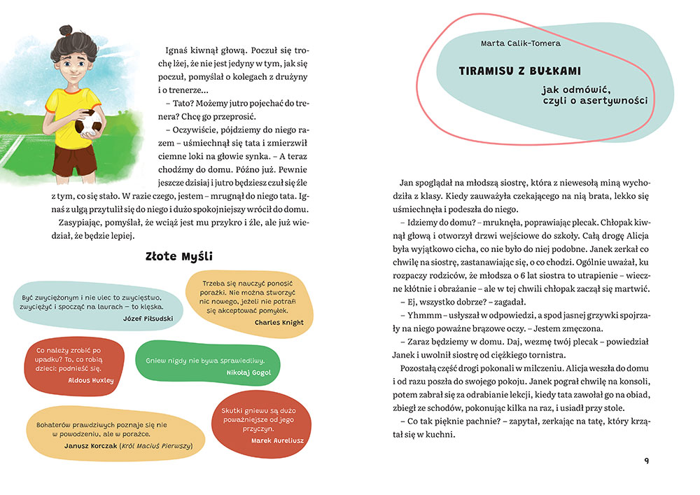 Ważnych tematów jest tu bez liku! Autorki nie omijały niewygodnych treści, wręcz przeciwnie – w bardzo dostosowany do wieku odbiorcy sposób przeprowadzą czytelników przez problematyczne sytuacje, w których pojawiają się w nas wątpliwości, dotyczące tego, jak należy się zachować i skąd czerpać odwagę, by postąpić właściwie, zwłaszcza w obliczu rówieśniczej presji i strachu przed odrzuceniem (...) krótko o ilustracjach. Świetnie dotrzymują one kroku narracji, podkreślając emocje bohaterów, a jednocześnie uatrakcyjniając samą lekturę. Są miłe oku, utrzymane w stonowanej kolorystyce i stanowią idealne dopełnienie całości, nie odwracając uwagi od najważniejszych treści, a wręcz przeciwnie, podbijając to, co najistotniejsze w każdym z opowiadań. Ważnym elementem każdego rozdziału są złote myśli, zamykające każdą opowieść. Sentencje filozofów, pisarzy czy przysłowia domykają każdy z tematów, mówiąc o tym wszystkim, co w relacjach z innymi i z sobą samym jest najważniejsze. Która z przytoczonych złotych myśli jest moją ulubioną?