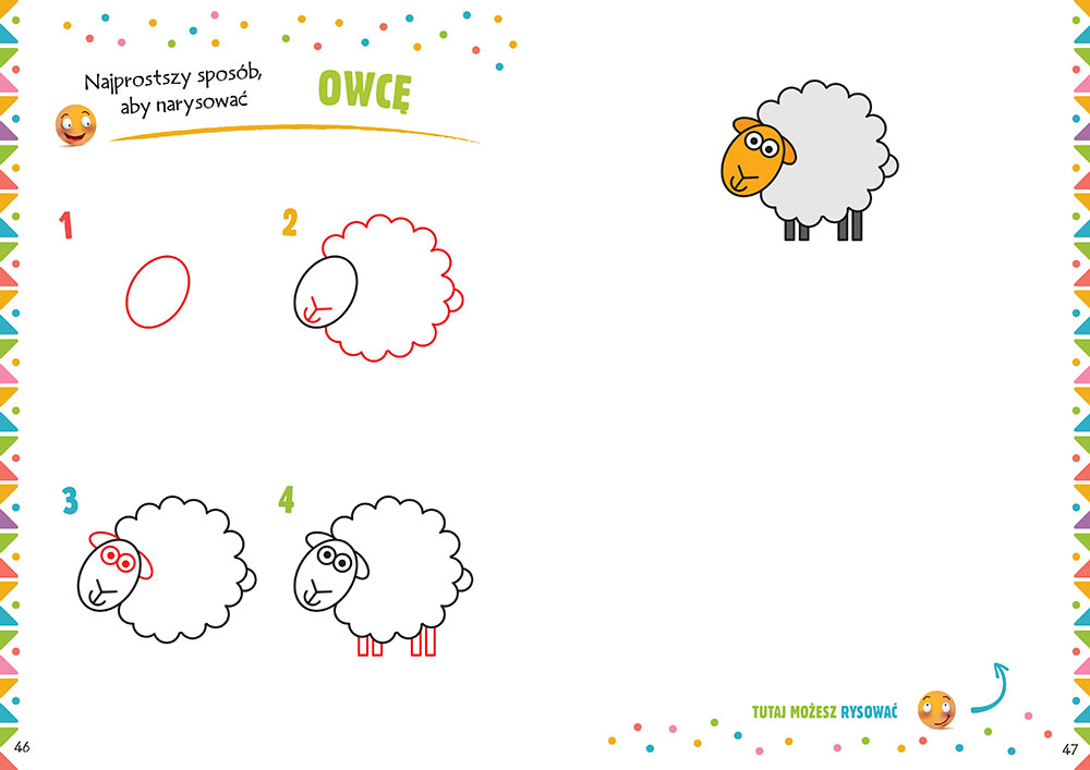 Sposób narysowania danej ilustracji przedstawiony jest po kolei w czterech najprostszych krokach. W każdym z kolejnych etapów rysowania zostały wyraźnie zaznaczone nowe elementy do dorysowania. Dzięki temu każde dziecko samodzielnie będzie w stanie narysować samochód, kotka, lalkę, motocykl czy tygrysa!