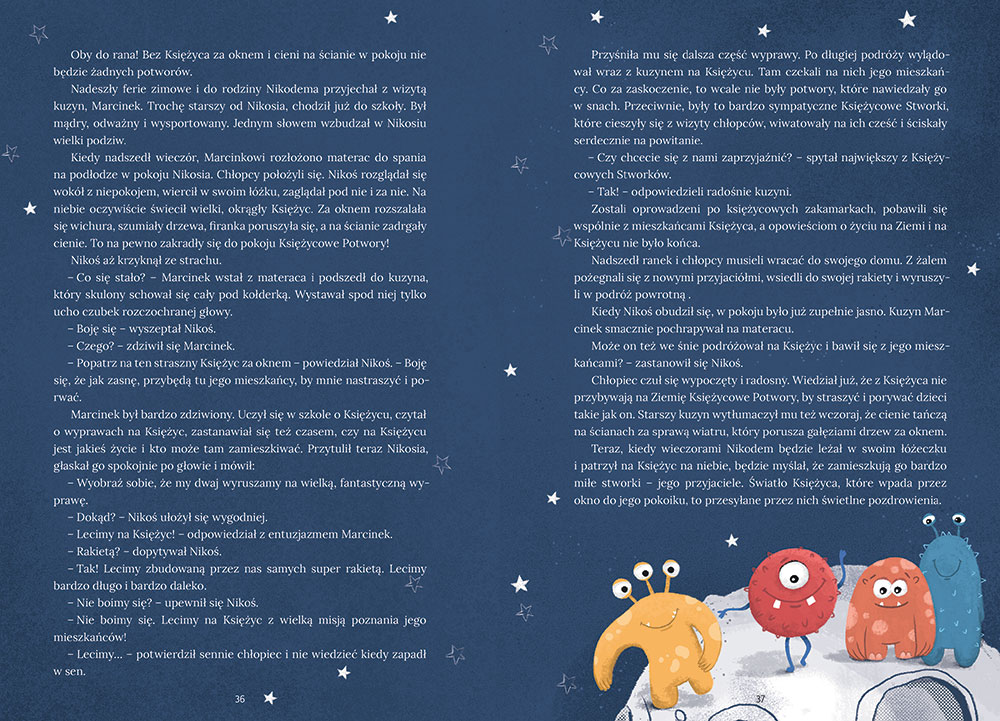 Historie przedstawione w bajkach zabieraj± naszych ma³ych czytelników w kosmos, na smocz± górê, razem z kurk± zgubimy drogê do domu, czy te¿ po prostu do mieszkania, w którym kto¶ zaczarowa³ papcie. Te z pozoru krótkie opowiadania zawarte w ksi±¿eczce „Bajki dla ch³opców. Przygody”, to tak naprawdê bardzo dobry materia³ dla nas i naszych dzieci. Co mam na my¶li? Mianowicie, wiêkszo¶æ dzieci boi siê sama spaæ w pokoju, boi siê ciemno¶ci, zw³aszcza gdy na przyk³ad przeprowadzamy siê do nowego domu, mieszkania, w którym ka¿da rzecz w nocy wydaje siê byæ potworem. I tej ksi±¿eczce znajdziemy pomoc – jest opisana historia ma³ego Tymka, który boi siê spaæ w swoim nowym pokoju, gdzie do ona wieczorem dobija siê ko¶cista rêka. Na pomys³ jak pomóc Tymkowi, wpada z powodzeniem jego dziadek. Razem mo¿emy poczytaæ z dzieckiem historiê ma³ego ch³opca i przedstawiæ mu, wyja¶niæ, co tak naprawdê widzimy w nocy i jak mo¿emy sobie z tym poradziæ. £atwiej bêdzie i nam i dziecku „popracowaæ” na przyk³adzie bohatera opowiadania, ni¿ na tak zwanym suchym przyk³adzie. Inn± bardzo ciekaw± bajeczk±, która na pewno nam siê przyda jest historia pewnej lisiej rodzinki, w której na ¶wiat przychodz± rudzi bracia i tylko jeden lisek – siostra jest bia³a. Z bia³ym liskiem nikt nie chce siê bawiæ, nie mo¿e znale¼æ przyjaciela, bo jest inny. A ile razy spotkali¶my siê ze s³owami naszych dzieci, ¿e ze mn± nie chc± siê bawiæ, lub jakiego¶ kolegi w przedszkolu nie lubimy, bo …. I tu padaj± bardzo ró¿ne odpowiedzi. Bo kolor w³osów nie ten, bo inny nosek, piegi na nosie. Ale i tym razem nie tylko nam rodzicom ale i my¶lê, ¿e i nauczycielom, czy te¿ wychowawcom w przedszkolu mo¿e przyj¶æ z pomoc± nasza bajka – w tym przypadku nasz bia³y lisek. Jak nasza bohaterka poradzi³a sobie z problemem, o tym ju¿ dowiemy siê czytaj±c bajeczkê.