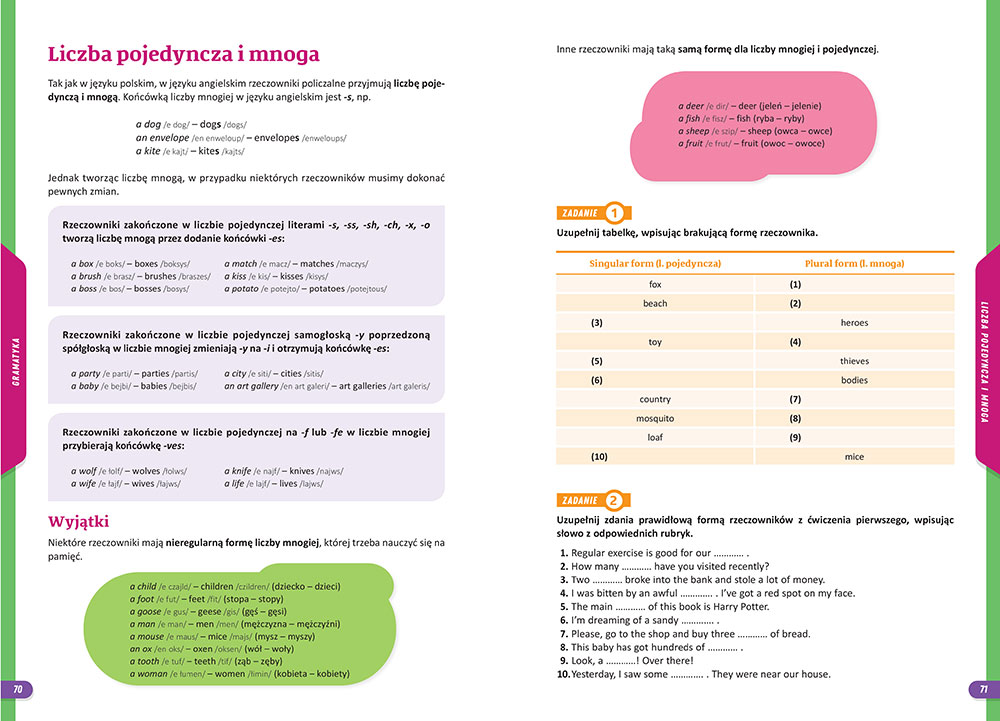 Uczeń znajdzie tu liczne ćwiczenia dotyczące słownictwa z różnych dziedzin, ćwiczenia gramatyczne wraz ze starannie wytłumaczoną teorią, dział językowy omawiający codzienne sytuacje komunikacyjne. Zadbano o to, by ćwiczenia odwzorowywały wszystkie typy zadań, jakie pojawiają się na sprawdzianach i egzaminach.