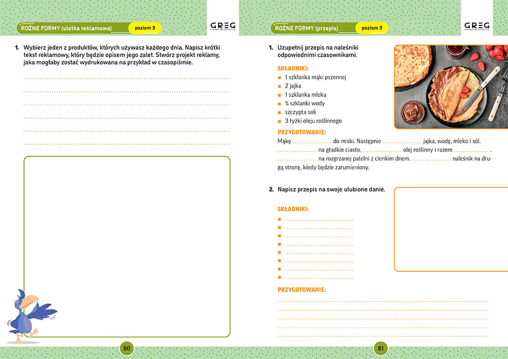 Publikacja jest przeznaczona dla uczniów klas drugich, trzecich i czwartych. Zawiera różnorodne i kreatywne zadania, dzięki którym można nauczyć się, między innymi, jak napisać poprawne ogłoszenie i zaproszenie, jak właściwie skomponować list oraz jakie elementy zawrzeć w opowiadaniu. W rozwiązywaniu zadań pomoże przedstawiona skrótowo i przystępnie teoria oraz liczne wskazówki, porady oraz zbiory przydatnych słów i fraz. Ćwiczenia są podzielone na trzy poziomy trudności.