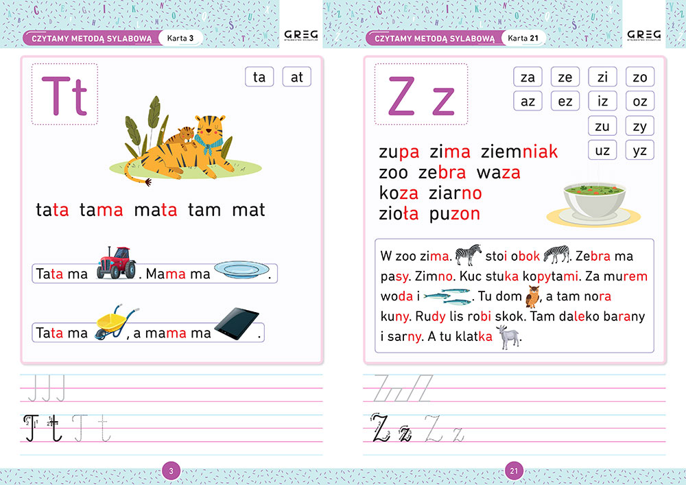 To właściwie karty pracy wydane w formacie książki. Według publikacji, w której autorka proponuje jedną kartę pracy dziennie, ale szczerze, niektóre zadania są tak świetne, że ciężko poprzestać tylko na jednej stronie, ale tu chodzi bardziej o systematyczność i zachęcenie dziecka do działania (...) Fajne jest to, że także najdziemy pismo obrazkowe, które dzieci uwielbiają. Na koniec uczymy się pisać daną literkę. Im poznamy więcej literek, tym czytanki są dłuższe, ale spokojnie słownictwo proste, każdy pierwszak spokojnie sobie z nimi poradzi.