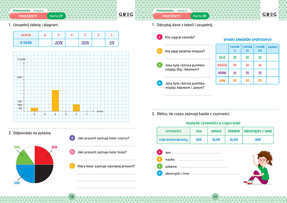 Karty pracy od Wydawnictwa GREG to nie tylko opracowany z najwy¿sz± merytoryczn± staranno¶ci± zbiór zadañ. To nowoczesna i wygodna publikacja z kolorow± szat± graficzn±. Na ka¿dej karcie zadania s± u³o¿one logicznie, co u³atwia naukê. Towarzysz± im liczne grafiki lub schematy, tabelki i wykresy, je¶li jest to wymagane. Pod tre¶ci± zadañ umieszczono miejsce na rozwi±zania, które pomie¶ci wszystkie niezbêdne obliczenia.