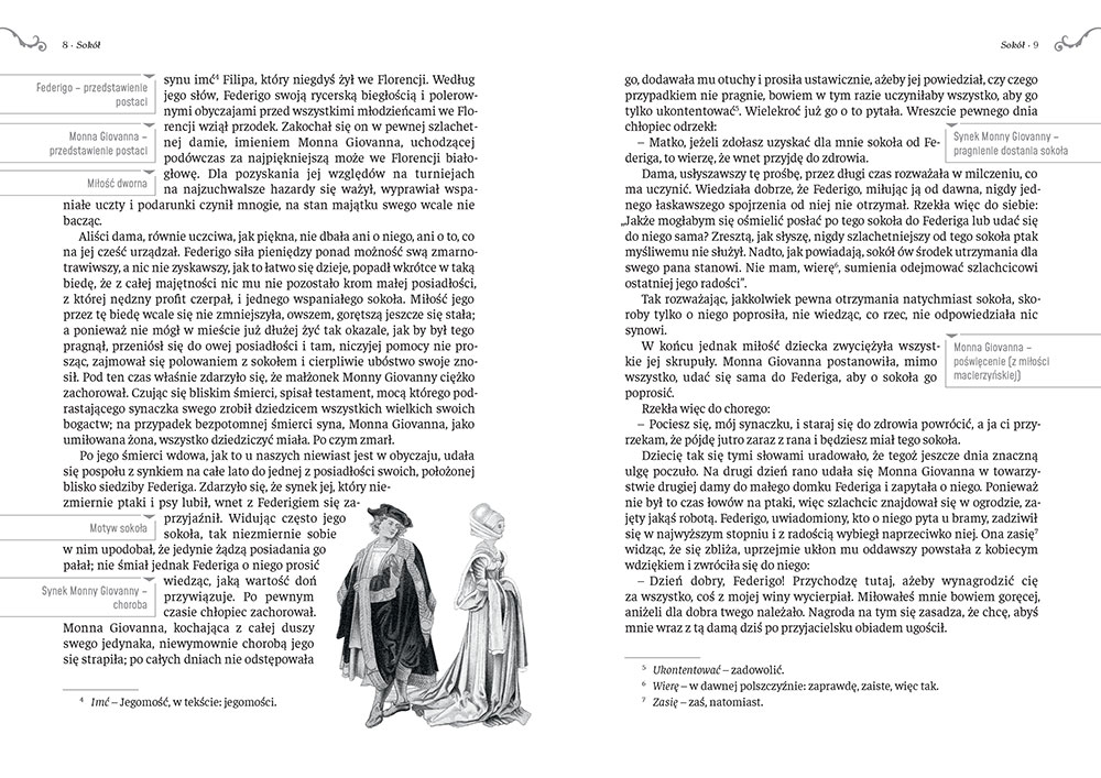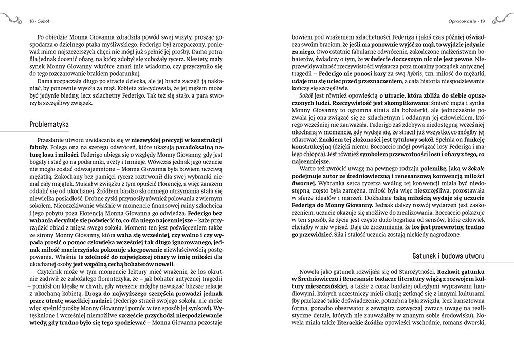 Sokół to jedna z najbardziej znanych nowel na świecie! Napisany w okresie włoskiego Renesansu utwór zapisał się na stałe w historii literatury. Wchodzący w skład sławnego cyklu nowel Dekameron Giovanniego Boccaccia, opowiada historię wielkiej miłości szlachcica Federiga do pięknej damy, Monny Giovanny. Mimo przeciwności losu Federigo został ostatecznie nagrodzony za swoją wytrwałość i stałość w uczuciach. A jaką rolę odegrał w tym jego wierny towarzysz - sokół? Przeczytajcie koniecznie!