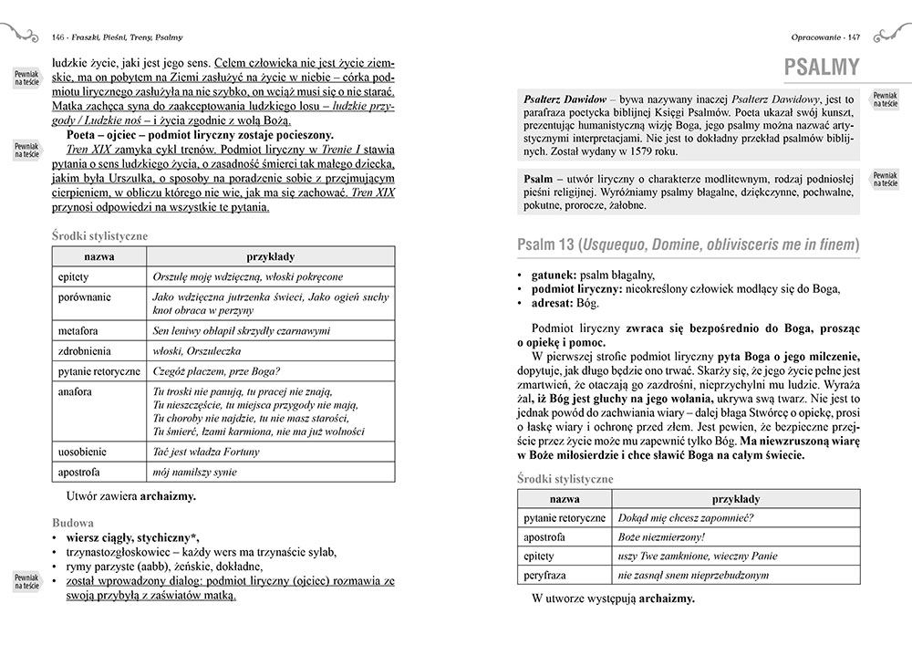 Wydanie Fraszek, Pieśni, Trenów kompletne bez skrótów i cięć w treści. W tym wydaniu znajdziesz odpowiedzi na pytania z podręcznika - „pewniak na teście”, czyli wskazanie zagadnień, które zwykle pojawiają się w pytaniach z danej lektury we wszelkich testach sprawdzających wiedzę, a także w podręcznikach i na klasówkach. Książka zawiera pełen tekst lektury. Na końcu książki zamieszczono opracowanie, w którym znajduje się bardzo szczegółowe streszczenie oraz drugie skrócone, ułatwiające szybkie przygotowanie się przed lekcją. Opracowanie zawiera ponadto plan wydarzeń, wnikliwie wyjaśnioną problematykę oraz szerokie charakterystyki bohaterów.