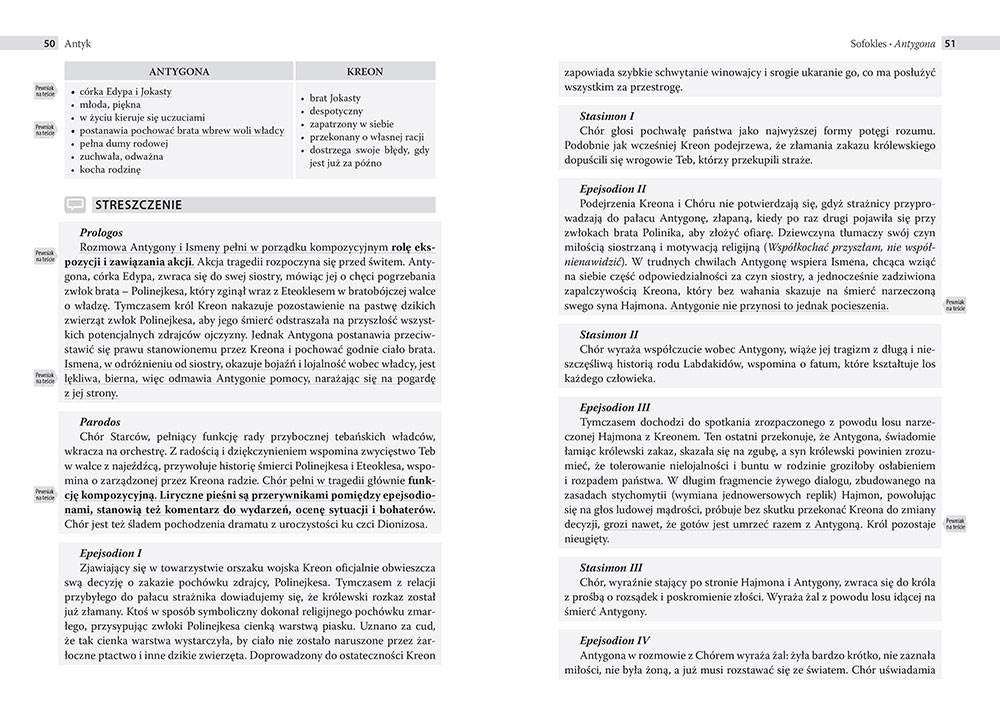 Obejmuje wszystkie lektury obowiązujące z zakresu podstawowego, które będą wymagane na sprawdzianach oraz na maturze z języka polskiego. Każda z lektur została dokładnie omówiona, zawiera streszczenia i problematykę, spis bohaterów, a całość uzupełniają notki biograficzne autorów. Ponadto zamieszczono w niej analizy i interpretacje wymaganych na języku polskim wierszy oraz omówiono cechy charakterystyczne każdej epoki literackiej. W części pierwszej, zgodnie z programem szkolnym, omówiono epoki od Antyku po Oświecenie.